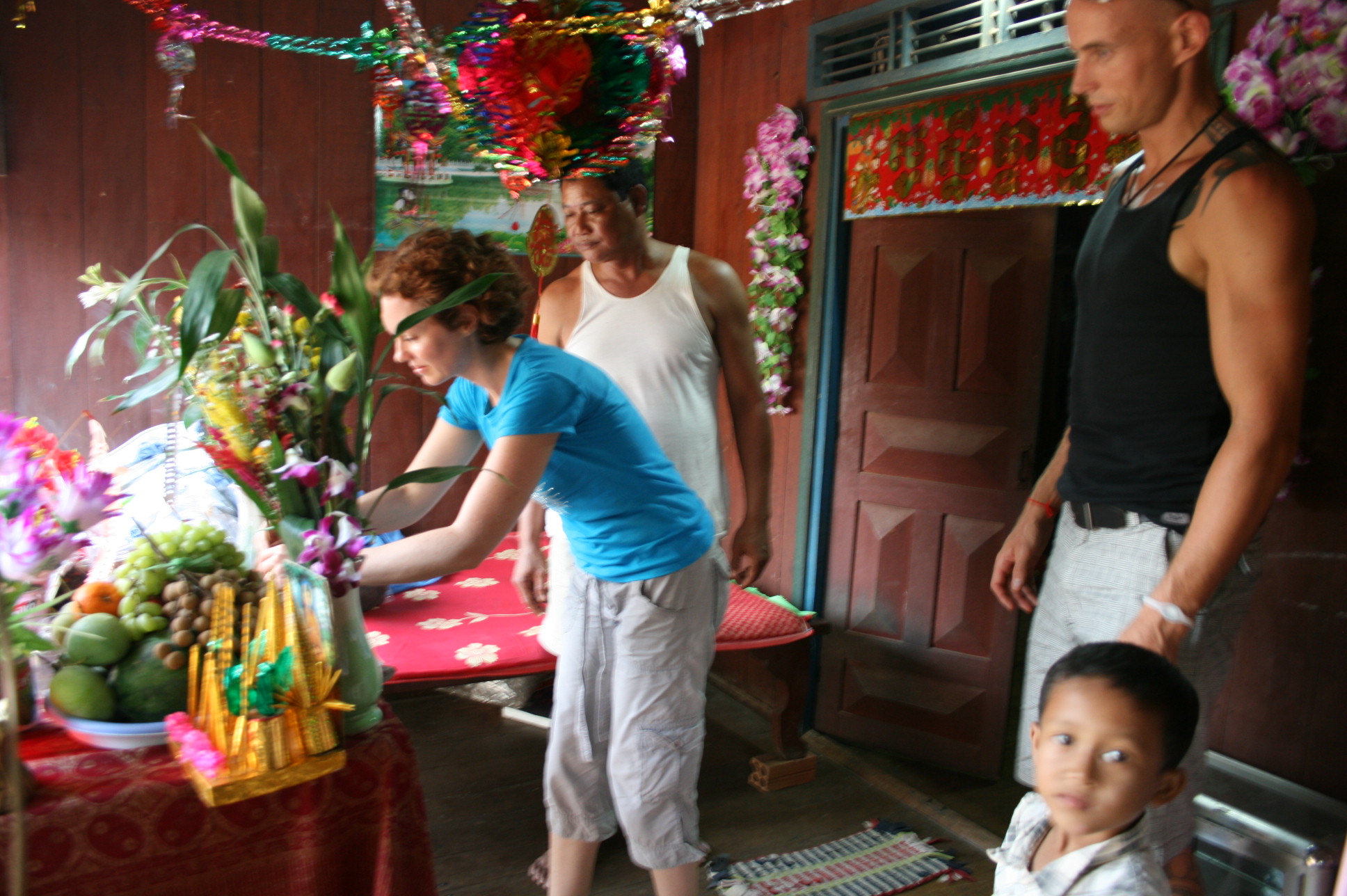 It wasn’t long before I restricted myself to small sips of beer (I was very conscious of the fact that Cambodian women generally don’t drink), although Colin quickly learned to say “Chol moi!” (sp? roughly “cheers, drink up”). While we were there we were invited to the balcony of Mr Bora’s house to see the family’s New Year shrine and light some incense.