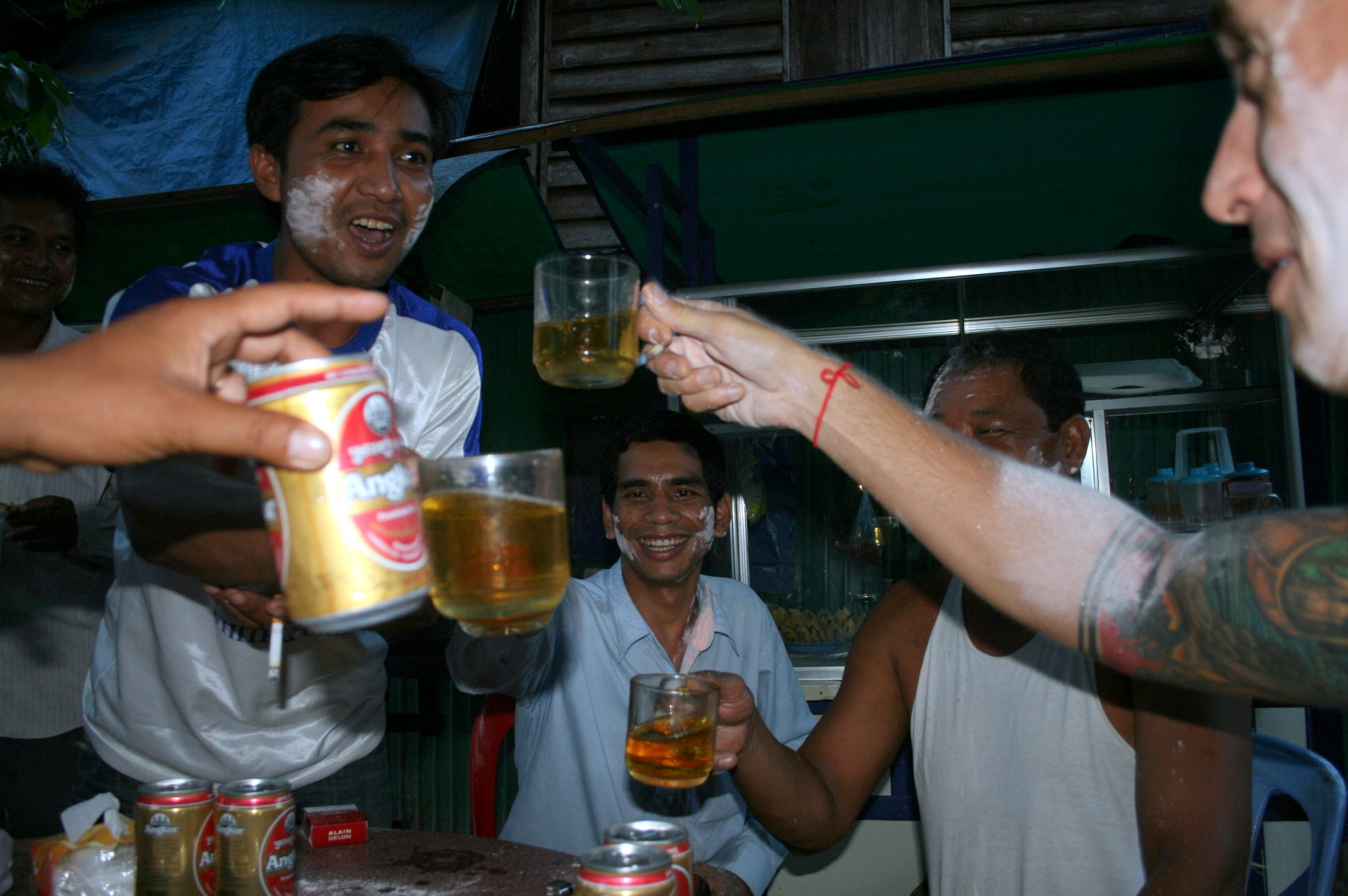 After a day visiting temples, our tuk-tuk driver, Mr Bora, invited us back to his house for a drink to celebrate the Cambodian New Year. We sat around a table in his backyard, drinking the local Angkor beer out of mugs (with ice added to compensate for the lack of refrigeration). Mr Bora and his friends, including the village chief, made us very welcome, providing food (e.g. fresh mango salad) and constantly topping up our glasses with beer, and later, a homemade whiskey.