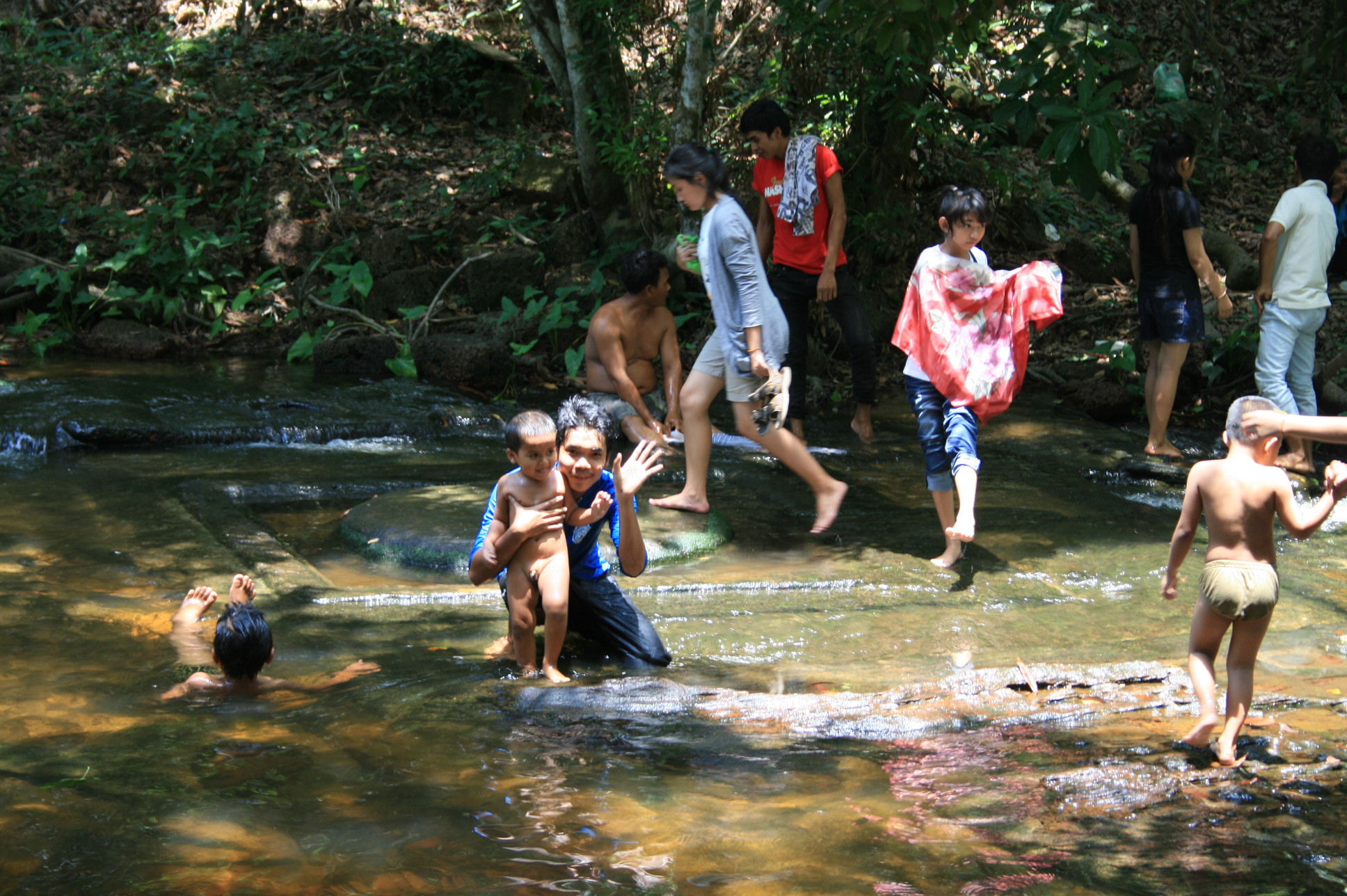 They also go to see Kbal Spean (the “River of a Thousand Lingas”), with carvings all along the stone river bed. The river banks were crammed with people having picnics. Many were swimming, or just sitting in the river. It was such a hot day that I was tempted to join them, but I only had my bikini, and was too shy to wear it away from the hotel pool (Cambodians are very modest and adults are usually well covered-up when swimming – only small children strip off).
