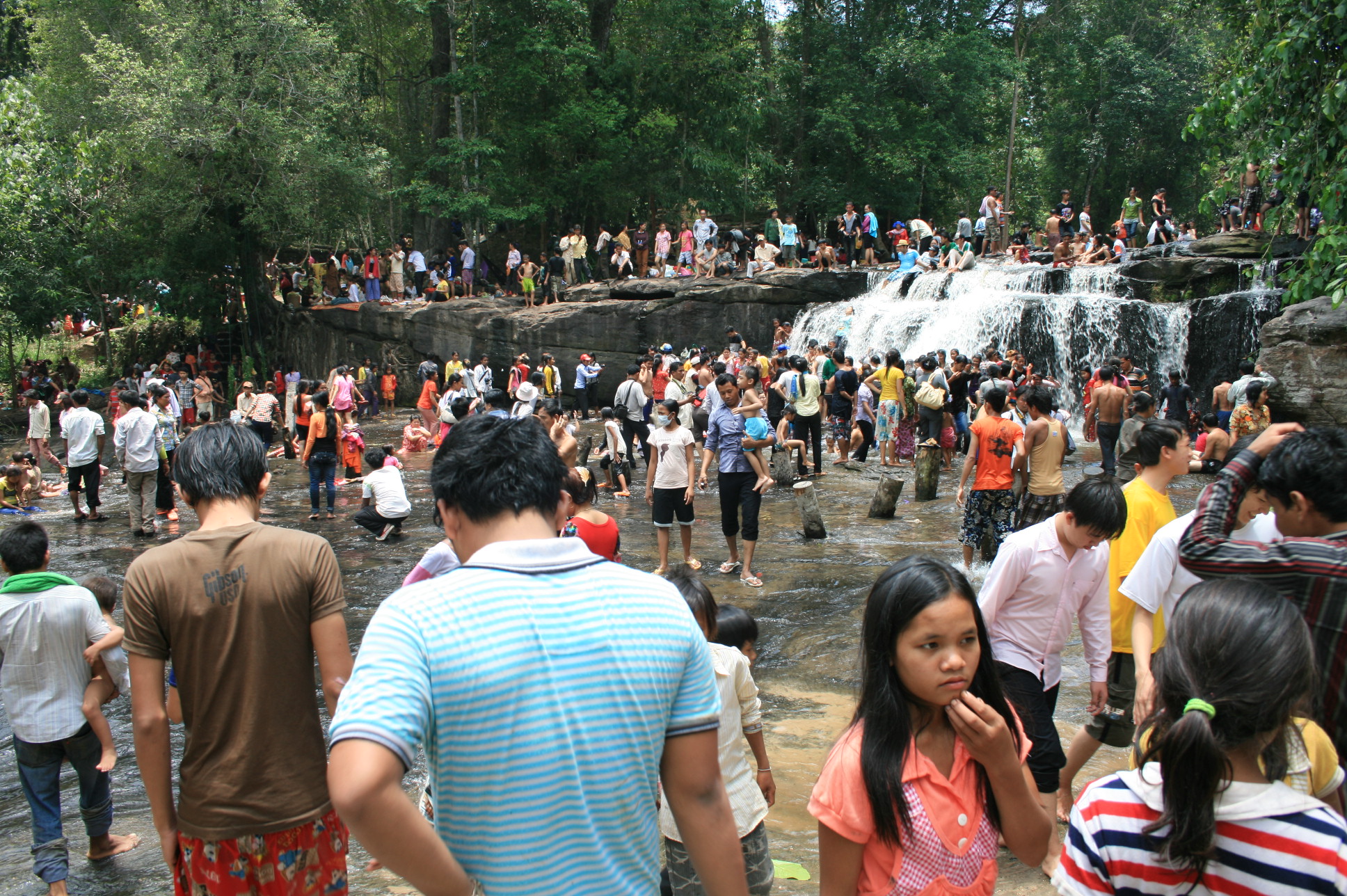 Further downstream there is a waterfall, as well as a small temple in a very ruined state. The river banks around this area were also packed with people. There were thousands of people up the mountain that day, and it is impossible to portray the intensity of such a mass of people in a relatively small geographical area. The photo below gives a sense of this.