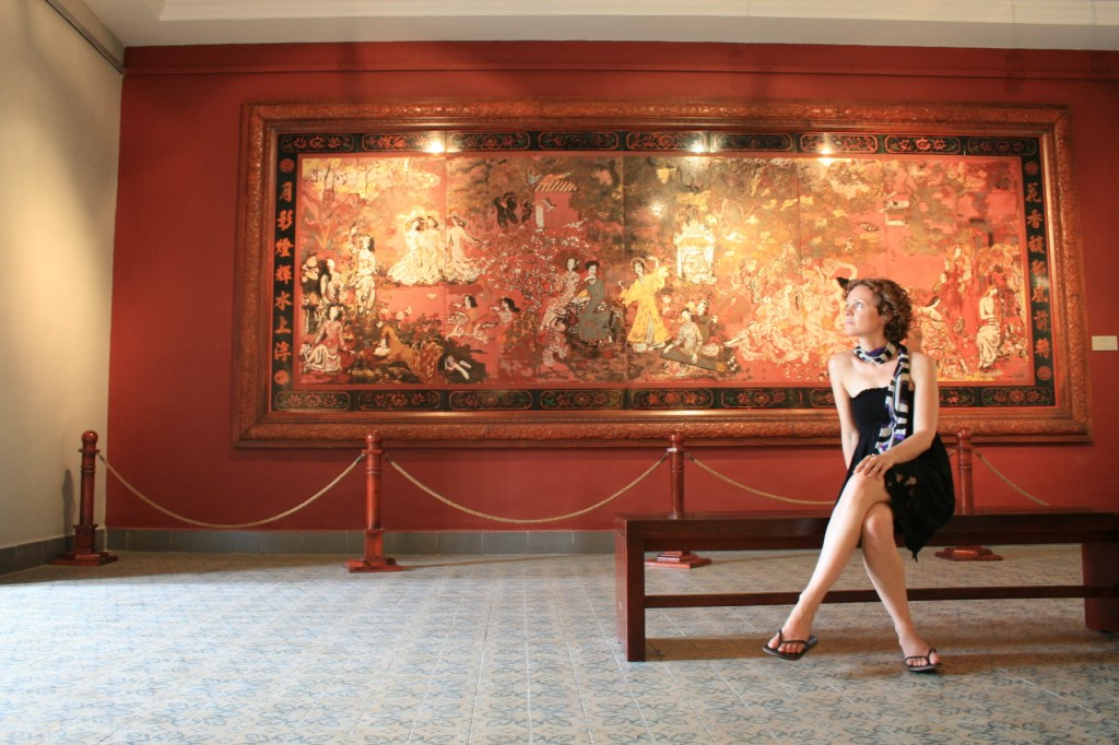 At the Fine Arts Museum, posing nonchalantly as per Colin’s direction.  This painting is by a contemporary Vietnamese artist who is a recognised master in lacquer-on-wood painting.  Up close, you can see that the lacquer technique results in a real sense of depth on the wooden surface – quite lovely.