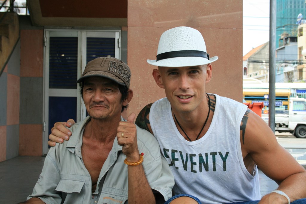 In general, we’ve found that people here aren’t quite as friendly as in Cambodia.  But this doesn’t mean that we haven’t met some lovely people, such as this guy who helped us catch the right bus to Cholon Markets. Colin’s tattoos continue to get heaps of attention wherever we go, opening up opportunities to talk – even if sign language is all that both sides can manage!