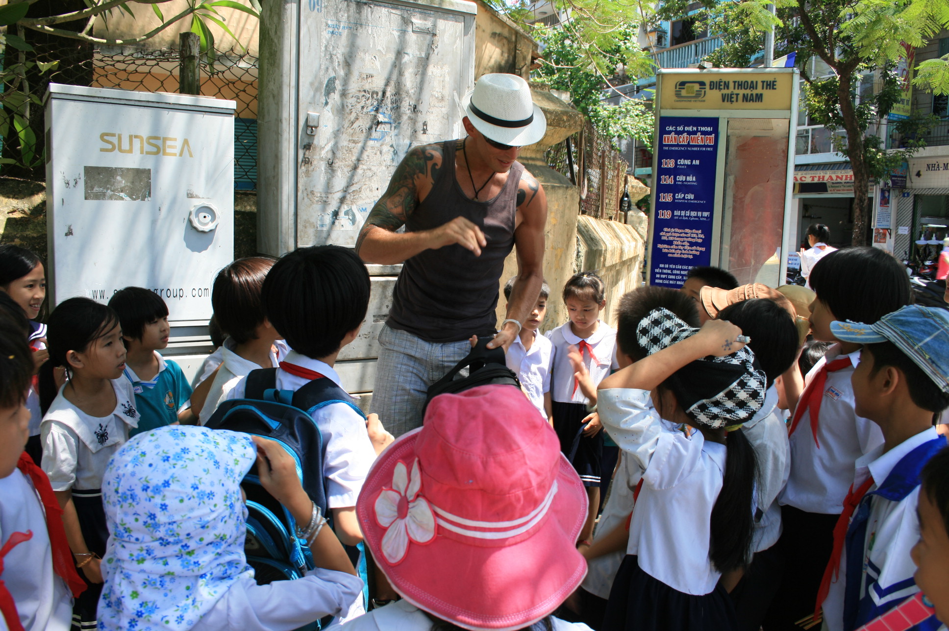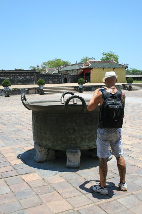 One morning in Hue I decided to take a ride in a cyclo over to a bridge by the Citadel walls. Colin elected to get some exercise by running the distance. Unfortunately, we got mixed up – he waited for me at a different bridge, and it took over half an hour for my cyclo driver to track him down. Colin didn’t have time to worry about having lost me as he was totally occupied in entertaining a group of local school kids. Apparently they were asking him to flex his muscles, and were fascinated by his tattoos, his size, and by how much he was sweating!!!