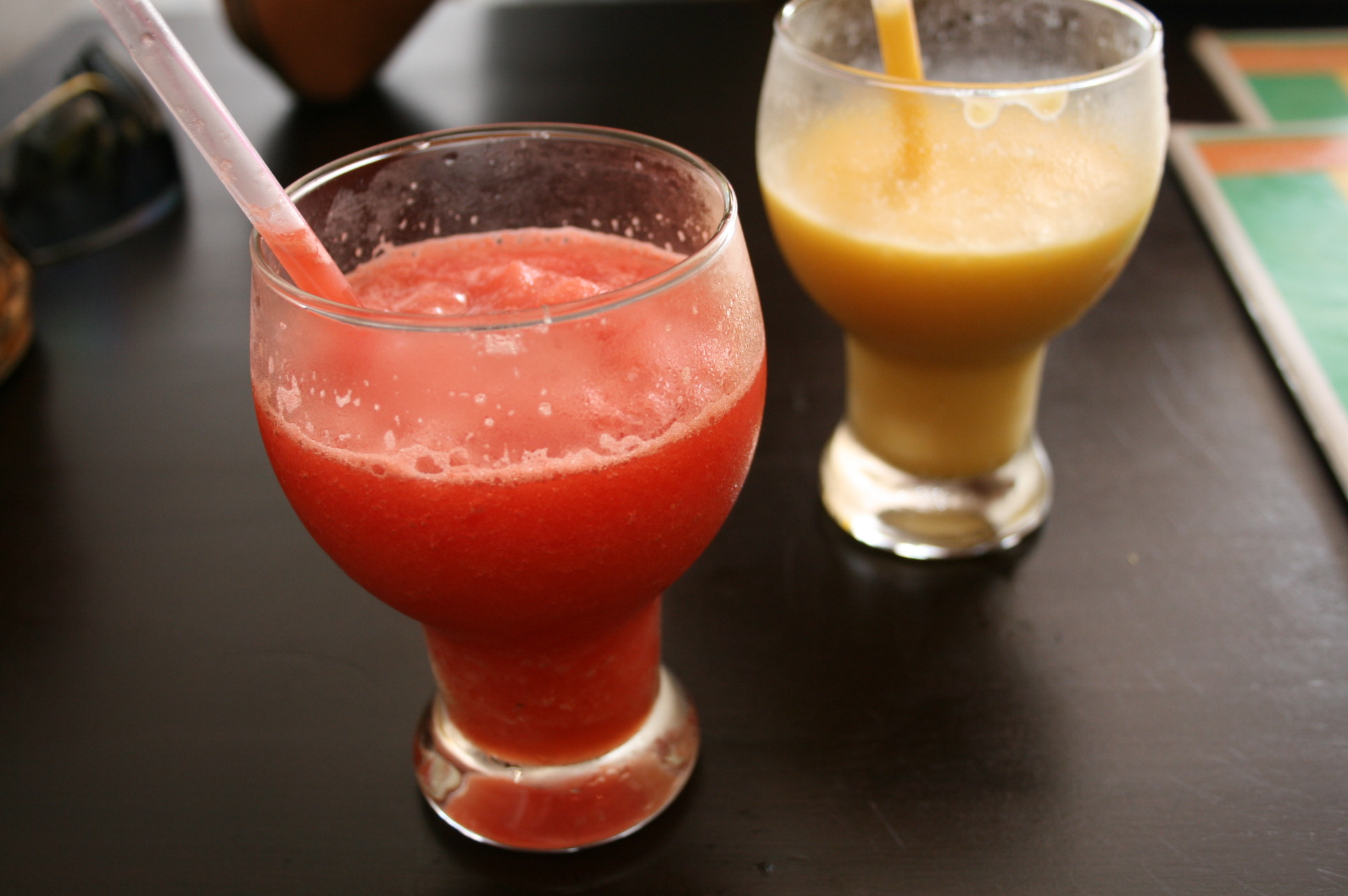 Fruit shakes at Noy’s – these two were watermelon and lemon, and mango, pineapple and coconut. Another fantastic combination was dragon fruit, melon and pineapple. Dragon fruit has white flesh with black seeds and tastes like a mild kiwifruit.
