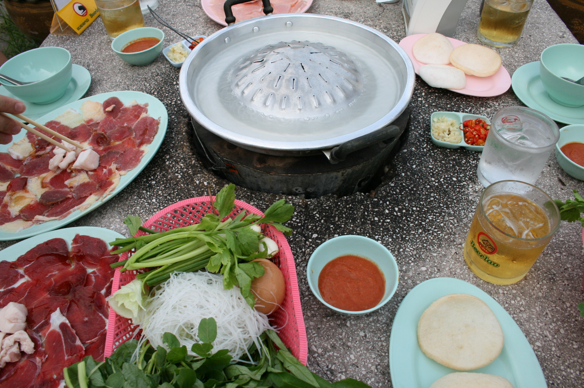 Hotpot – at the centre of a circular table is a barbeque hot plate. The plate has a central dome, on which you cook meat, and a recessed edge, which you fill with hot water. We were supplied with baskets of fresh greens and plates of thinly sliced raw meat. You cook the greens in the water and the meat on the dome. The meat juices run down into the water, and by the end of the meal, a tasty soup has been created.