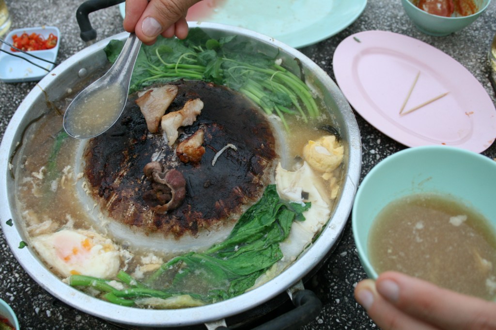 The green vegetables were probably my favourite part – they tasted so fresh. We also had a type of mild seaweed that we cooked in the water, as well as rice noodles, and whole eggs. All meat and veges were dipped into a tasty sauce made from peanuts, garlic and chilli. The white lumps in the centre of the hotplate are lumps of pure pork fat – not skin, just fat. It was lovely – toasted to a crisp on each side, with the inside still meltingly soft…despite the taste sensation, eating pure fat was a bit terrifying and I could only bring myself to eat one piece.
