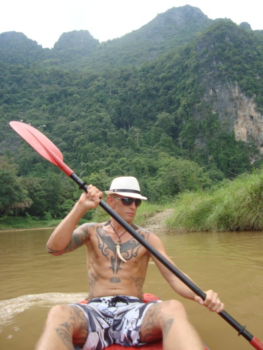 After lunch we got into kayaks and paddled down the Nam Song river – the infamous tubing route – stopping at the Mud Bar on the way past. For some reason, the river and bars were very quiet that day. It had poured with rain all morning, so perhaps the tubers were munching happy pizzas back in town.