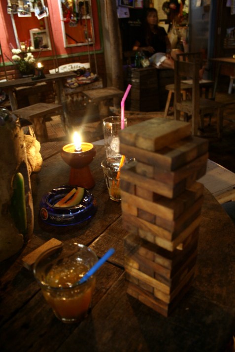 Phad Krathiem Prik-Thai, or stir-fried tofu and vegetables with fried garlic. The garlic is actually pre-fried to an intense crisp and sprinkled over the vegetables at the end. This was the first dish I ate in Pai, and I had it 4 times in total, relishing the simple flavours and chewy rice. It also cost only 30 baht, which is about $1.25 NZ, so I could order a beer too. (Wait, does beer cancel out the brown rice?)