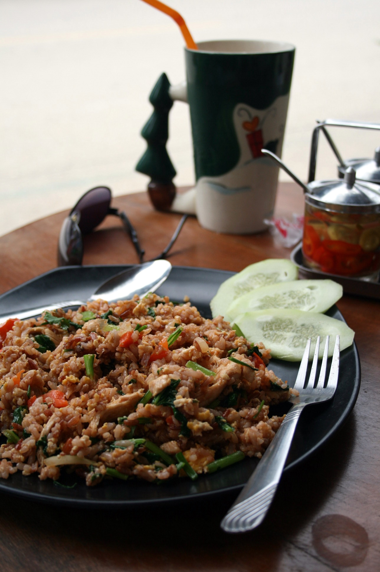Khao Pad Mou – fried rice with chicken and vegetables. Yes, more brown rice, this time enhanced with a bit of frying and the addition of, well, chicken and vegetables. Nutritious food and psychological comfort in each bite 🙂