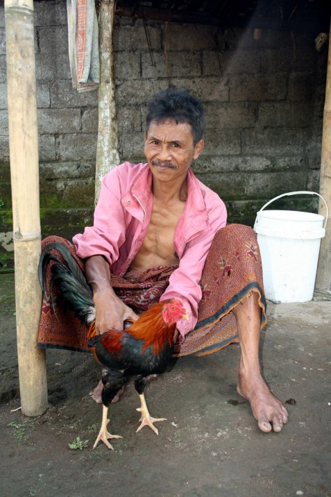 Partway through the bike ride we stopped at a traditional Balinese home compound. It consisted of several buildings, each with their own function (sleeping, kitchen, ceremonies etc). The property was thick with fruit trees and vegetable gardens, chickens and pigs. Cock fighting is a huge sport for the local Balinese, and roosters-in-training (such as the one in this photo) are prized possessions. They are massaged daily, fed special food, and generally coddled, only to later die a bloody and painful death for the amusement of the audience.