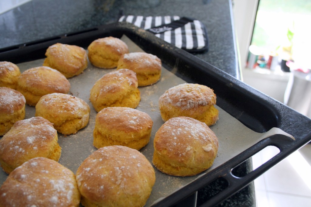 Preheat the oven to 225°C/440°F.  Cream together the butter, sugar and salt for two minutes.  Add the egg and beat for a further minute.  Add the cold mashed pumpkin and beat for a further minute.  Stir in the flour by hand, starting with the smaller amount and adding the extra 1/4 cup if the mixture feels too sticky.  Turn out onto a floured bench or board and press out to a thickness of roughly 1 inch.  Using a small water glass, cut rounds of dough, placing each on a baking tray.  These scones tend to brown quickly on the bottom, so Flo recommended placing the tray on the top shelf of the oven.  It’s good advice.