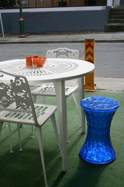 Blue stool, shining jewel-like on a grey Sunday morning: at Flamingo Cafe on Winn Lane. Soon after I took this photo a colourful couple sat here. The black-haired girl wore an emerald dress, and her partner, who sat on the blue stool, had on a bright yellow T-shirt. The waitress served them water in ruby red tumblers. Did they have any idea how perfect they looked? I have yet to master the skill for covert photography (which is probably 99% nerve), so this particular image remains mine alone.