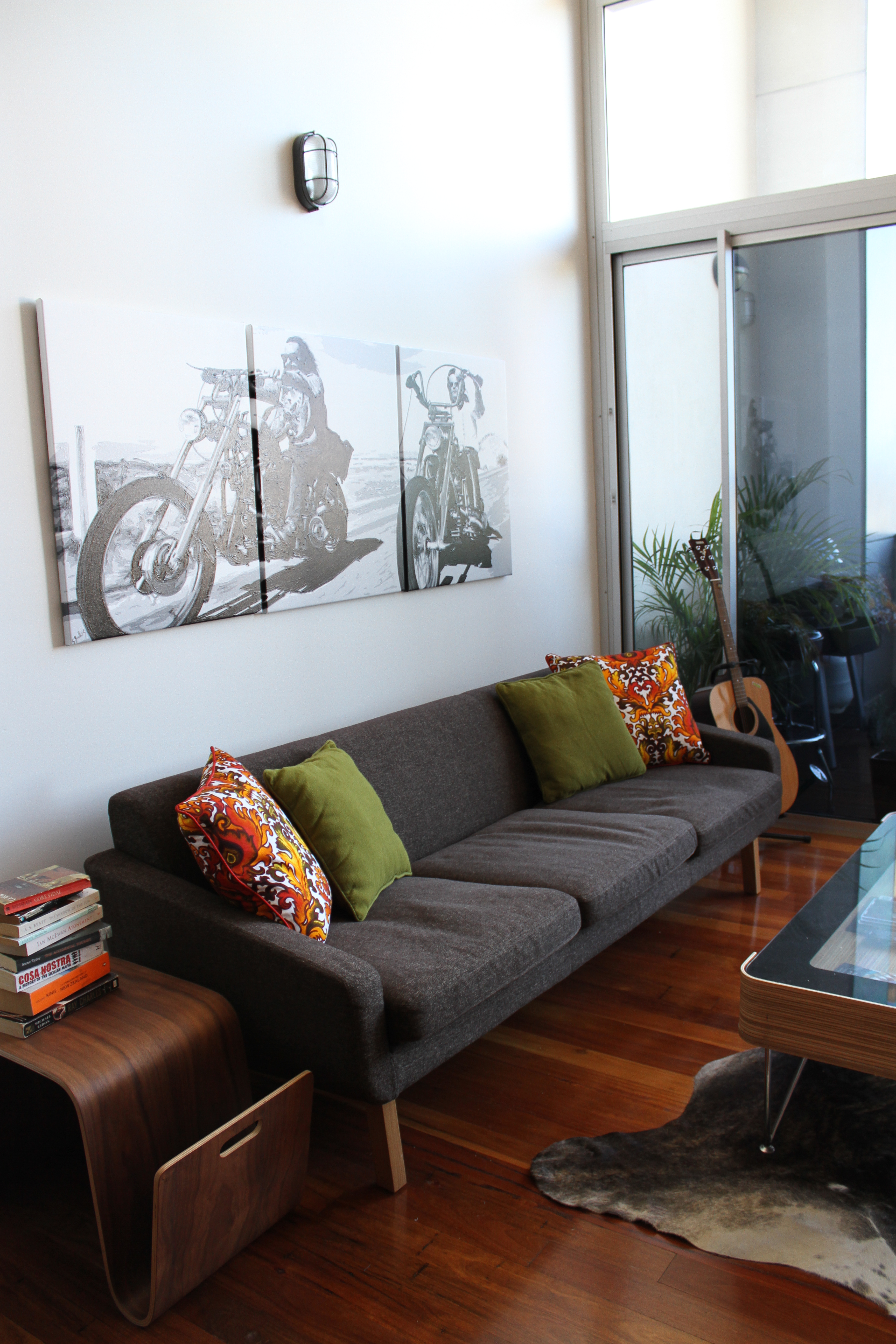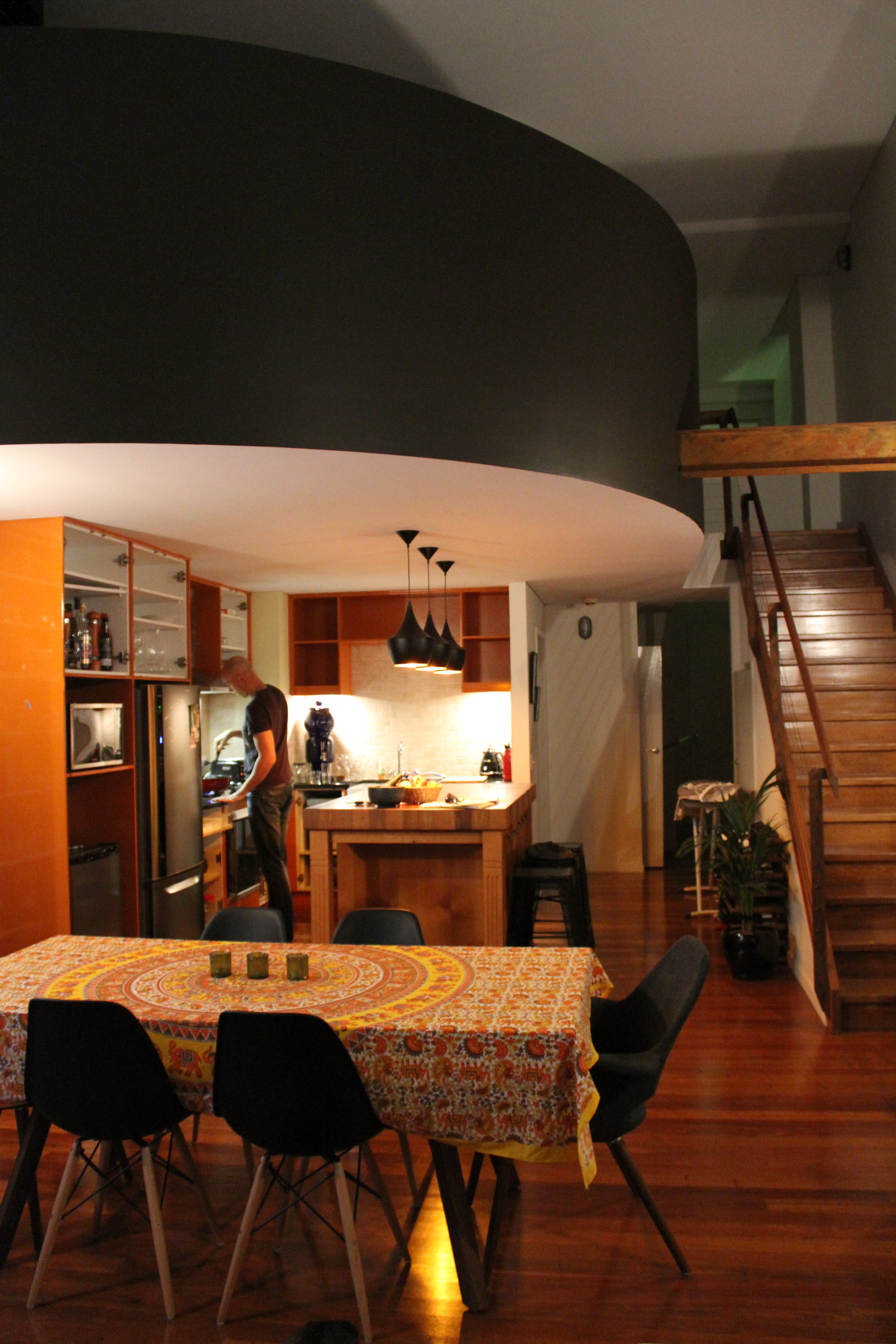 For six week after we moved in we continued to refine our ideas (60s/70s inspired), finally purchasing furniture then moving on to homely little details like pot plants, cushions and artwork.  We also undertook some renovations, repainting the ceiling, putting a rust-effect paint on the steel beam, and inserting an injection of colour by painting the curved mezzanine wall a rich brown, the exact shade of dark chocolate.  We replaced the dated light fittings with bulkhead-style lights ($11 each from Bunnings, rather cleverly jazzed up with a textured charcoal powder-coating), and installed replica Tom Dixon pendant lights in the kitchen.  The kitchen itself had been recently replaced, but we weren’t keen on the buttery yellow cabinetry, which took on a tinge of lime under the halogen lights.  We decided to repaint it a bold burnt orange to top off the retro vibe.