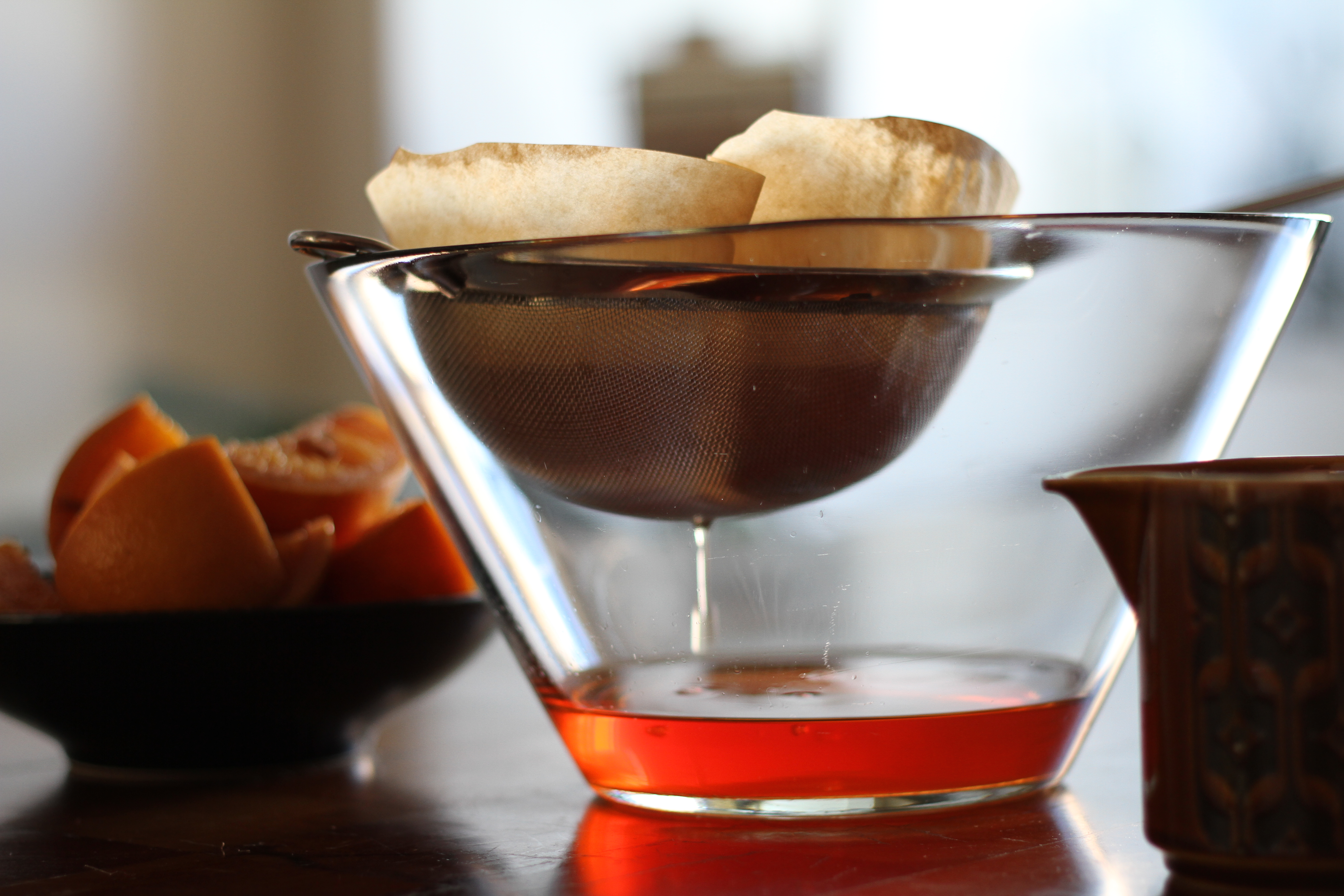 Once the two weeks are up, remove the oranges and spices and strain the liquid through cheesecloth or a fine strainer. I found that the liquid still looked rather murky after this, so I strained it again through coffee filters placed in a sieve set over a bowl. The slowness of the dripping drove me insane with anticipation, but the brilliantly clear orange liquid that resulted was worth the wait. Funnel the vin d’ orange into a clean bottle and store in the fridge, where David promises it will keep for six months (mine definitely won’t last that long).