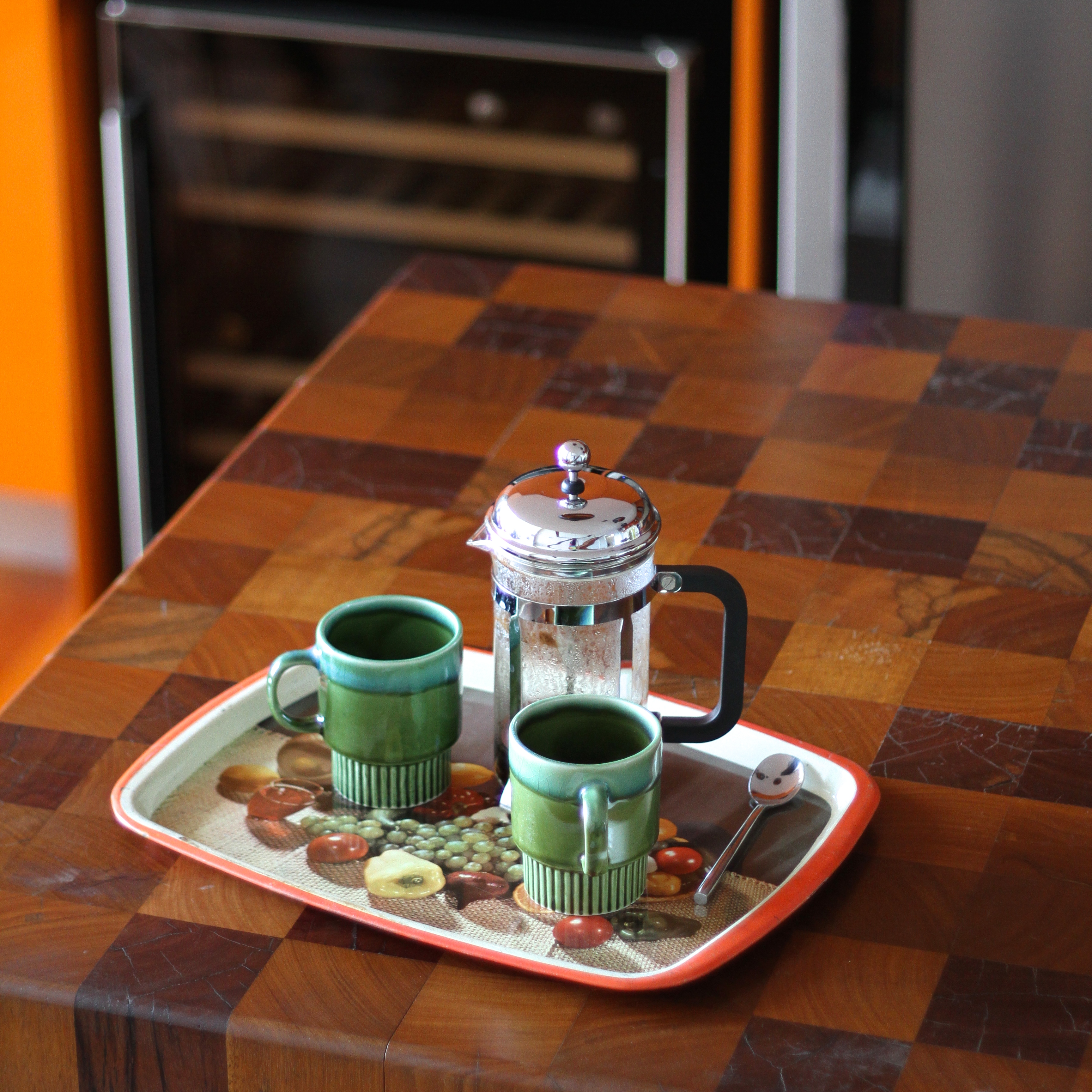 Enamel tray featuring Still Life of Fruit, found at a recycled store in Paddington; two green mugs that remind me of everyone’s childhood, found at the local Red Cross store; the coffee plunger was a secret Santa gift from work last year; and the teaspoon might have just followed us here from our last apartment, not far from here.