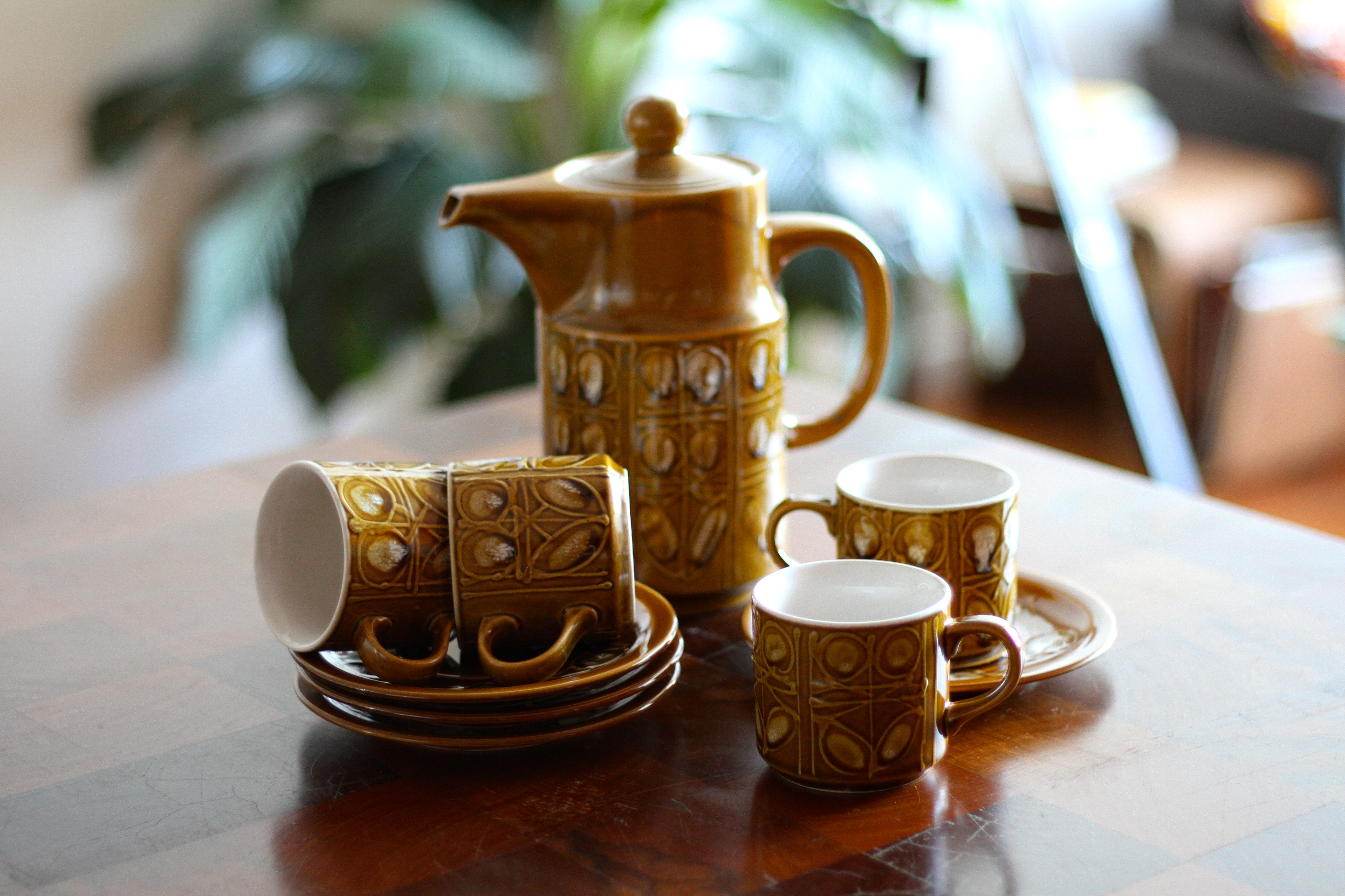 Hornsea Pottery from the early 1960s. The small brown jug and mustard pot were found at a recycled store in Paddington. The large green coffee pot was found at a new antique store, Rare, in Montville during a recent excursion when Mum, Dad and Kerry were staying with us.