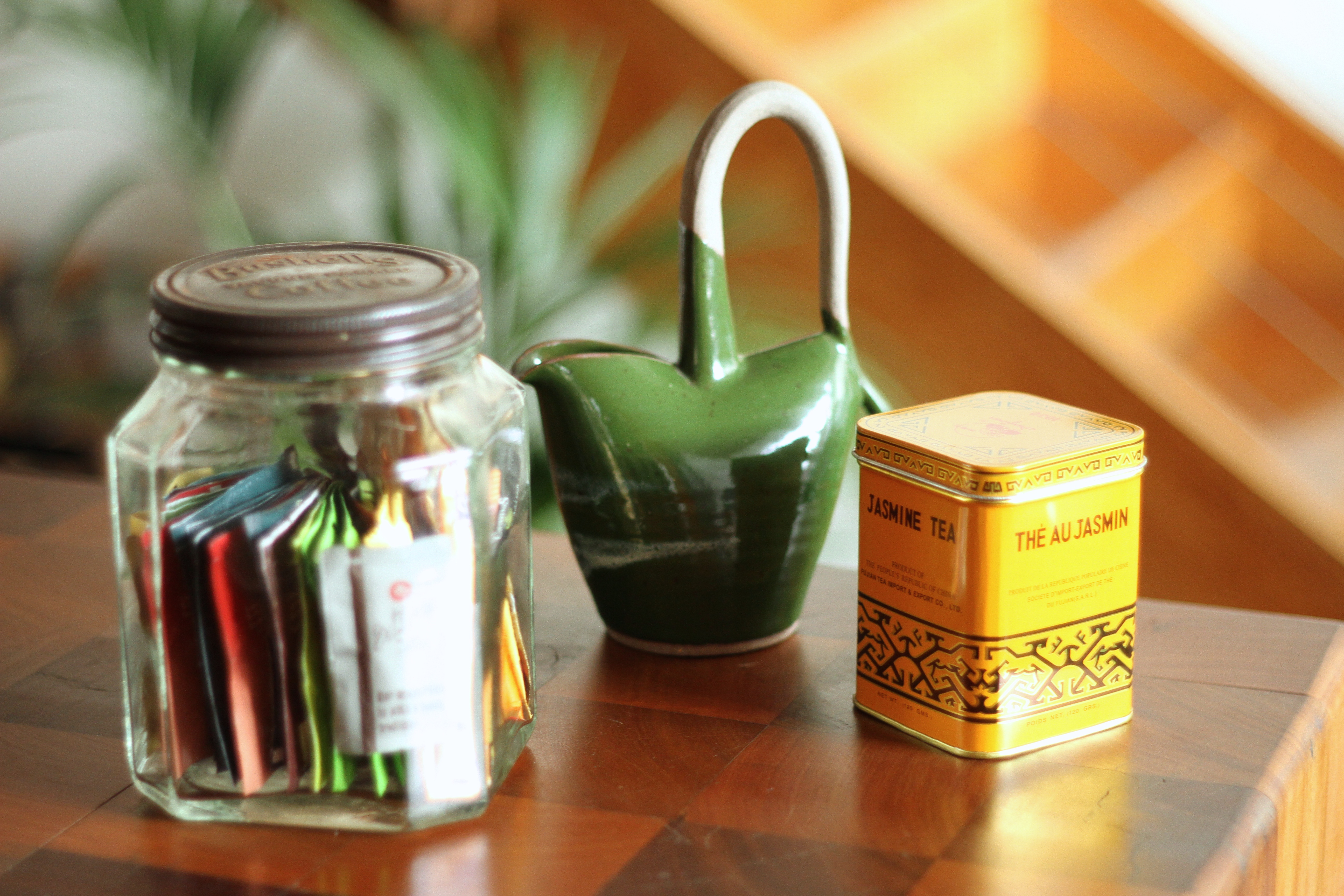 Old Bushells coffee jar, found at Vinnie’s, filled with random teabags and sugar sachets in the manner of Kerry C; tin of jasmine tea from the Chinese grocer on the corner; green pottery jug, found while combing recycled stores with April this summer.