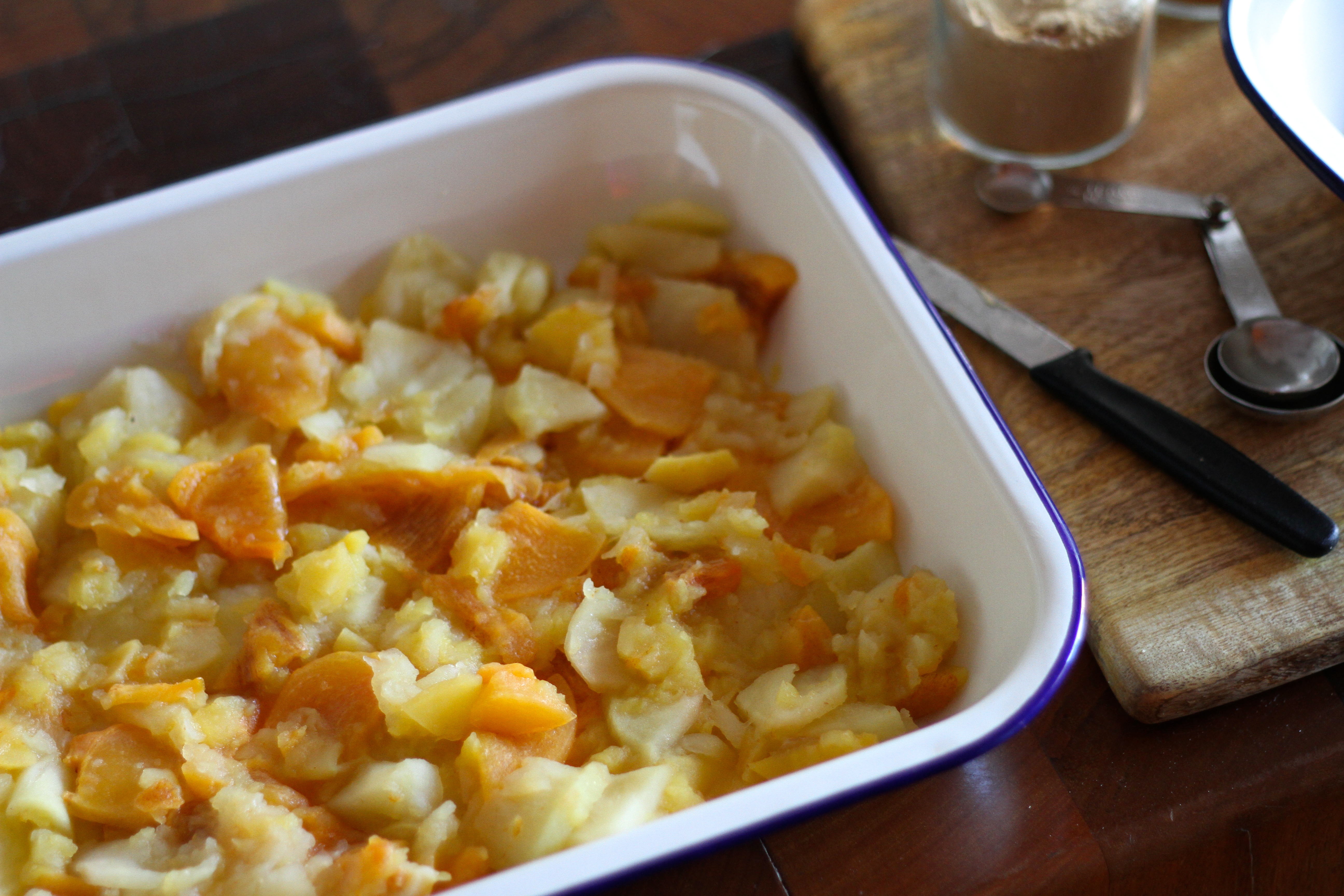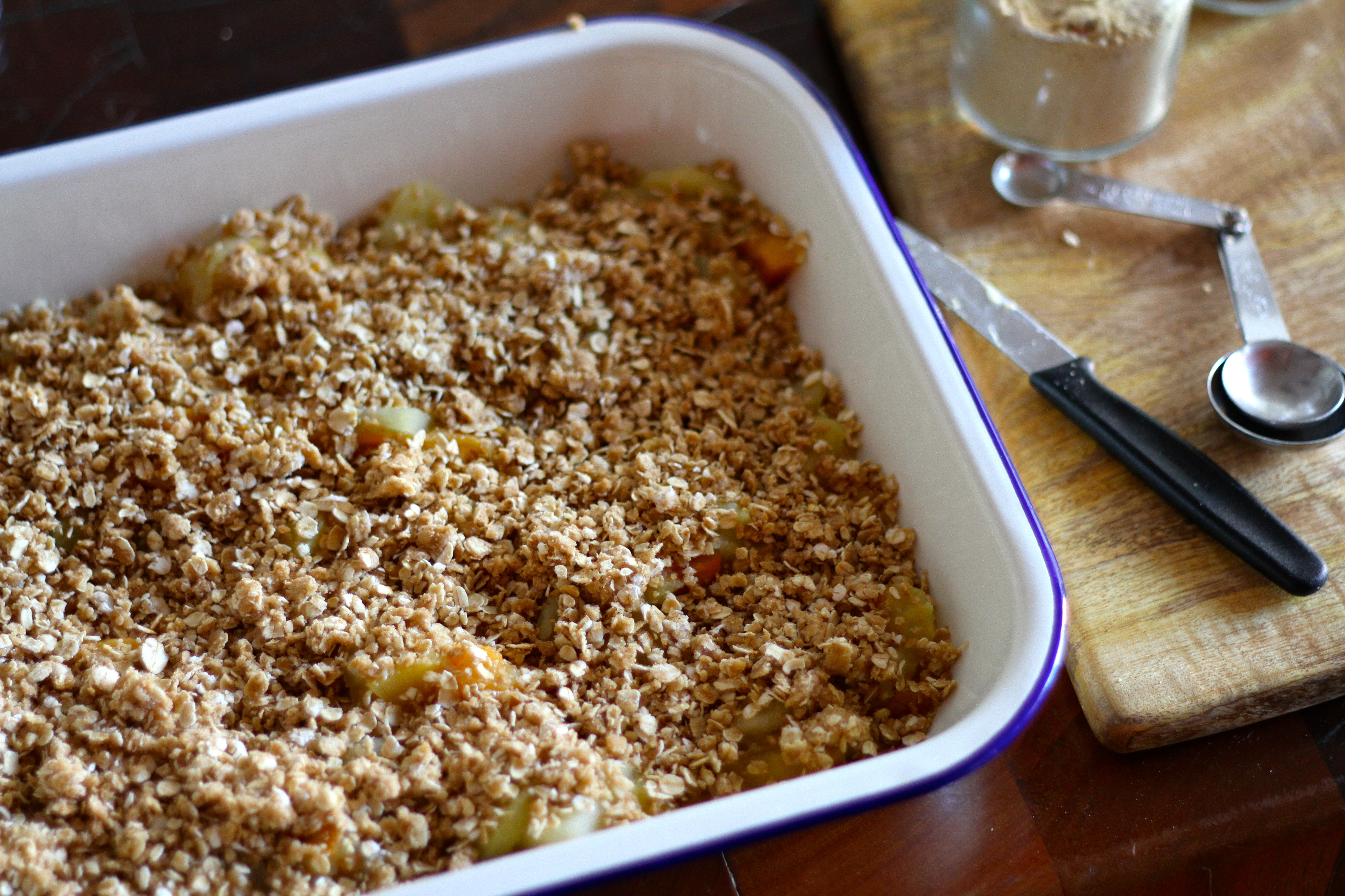 Once the fruit has softened, transfer to a shallow baking dish and spread evenly over the bottom. Top with the oat mixture and place the dish in the oven. Bake for 30-40 minutes, or until the oats have browned. Eat warm with a drizzle of cream or custard, or cold with unsweetened yoghurt.