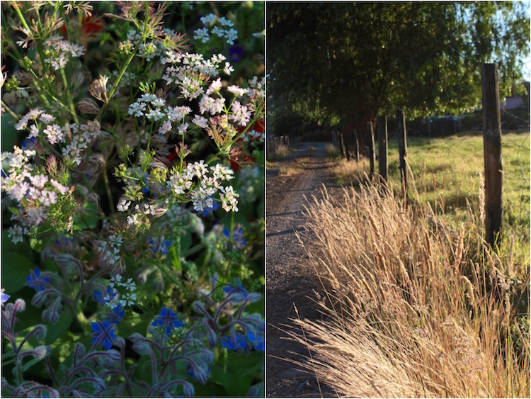 Borage and coriander flowers with green and gold driveway