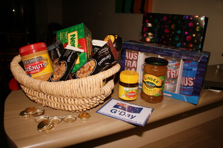 And because I just can’t post without a photo or two (no matter how bad they are), below is a picture of the cake (sans the chocolate star decoration (à la Deb) that was applied shortly before leaving our apartment), and a photo of the Aussie-themed surprise gifts we received from Maria (Vegemite and Buderim Ginger Marmalade), Gary and Karen (Australia-themed tumblers), and Angela (a basket of Nerada Tea, Ozenuts Peanut Butter, honey from Victoria and Carmen’s muesli bars). We’re pretty lucky, Colin and I.