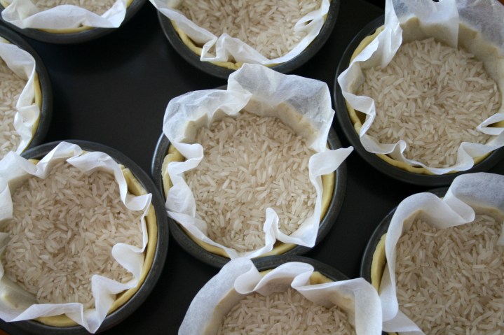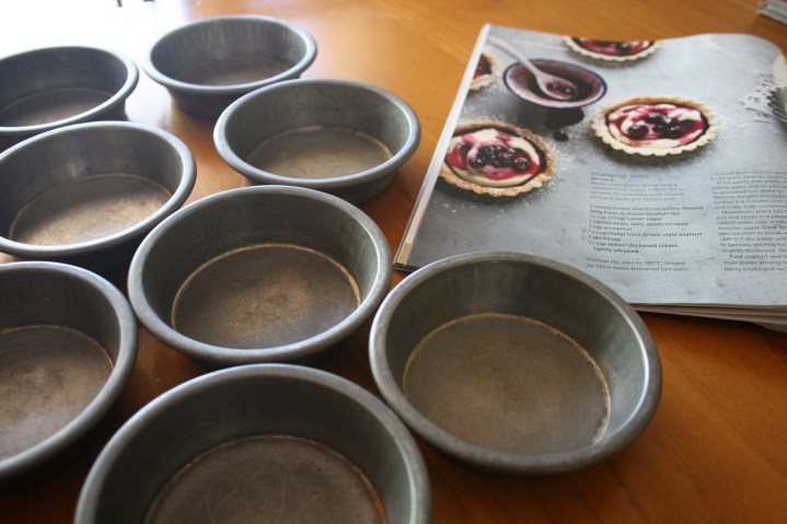 After researching how to clean old metal tins, I proceeded to scour them with baking soda and hot water. Once refreshed of their rusty-tinge, I buttered them, inserted circles of baking paper in their bottoms (Valli’s recipe called for loose-bottomed tins, so I wasn’t going to take any chances), folded shortcrust pastry gently into their depths, chilled them, lined them with more baking paper filled with rice, blind baked them for ten minutes, removed the rice and paper, and baked them for a final five minutes. (One of) my idea(s) of a good time is kitchen-pottering, but after this two-hour period chained to the kitchen bench I cursed my folly, swearing never to bake tarts again.