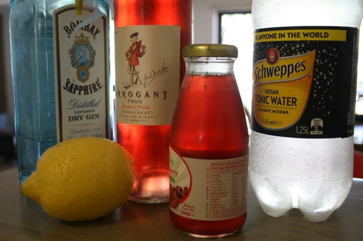 While the tart cases were baking, I proceeded to make the cocktail for the event, which constituted the “entree” course of the meal (what? Cocktails are carbohydrates (and hence a food group) aren’t they?). This recipe for Pink Gin & Tonic made a delightful beverage that revived my vulnerable resolve.