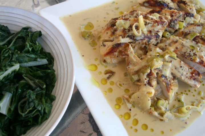 This sunshine-in-a-glass was consumed gradually over the next hour or so as Colin and I watched an episode of Mad Men, which we were completely absorbed with at the time. Suitably rested, I then tackled the main course, Jamie Oliver’s tasty dish of cream-and-mustard-sauced chicken; the recipe for which I had seen made on TV and later scribbled down from the cookbook that Amy had conveniently acquired. To accompany this, I steamed a bunch of silverbeet, requiring, as I usually do, the unadulterated irony-tang of simple green vegetables to offset the richer star of the show. The heat of the day dictated that further additions to the plate be eschewed.